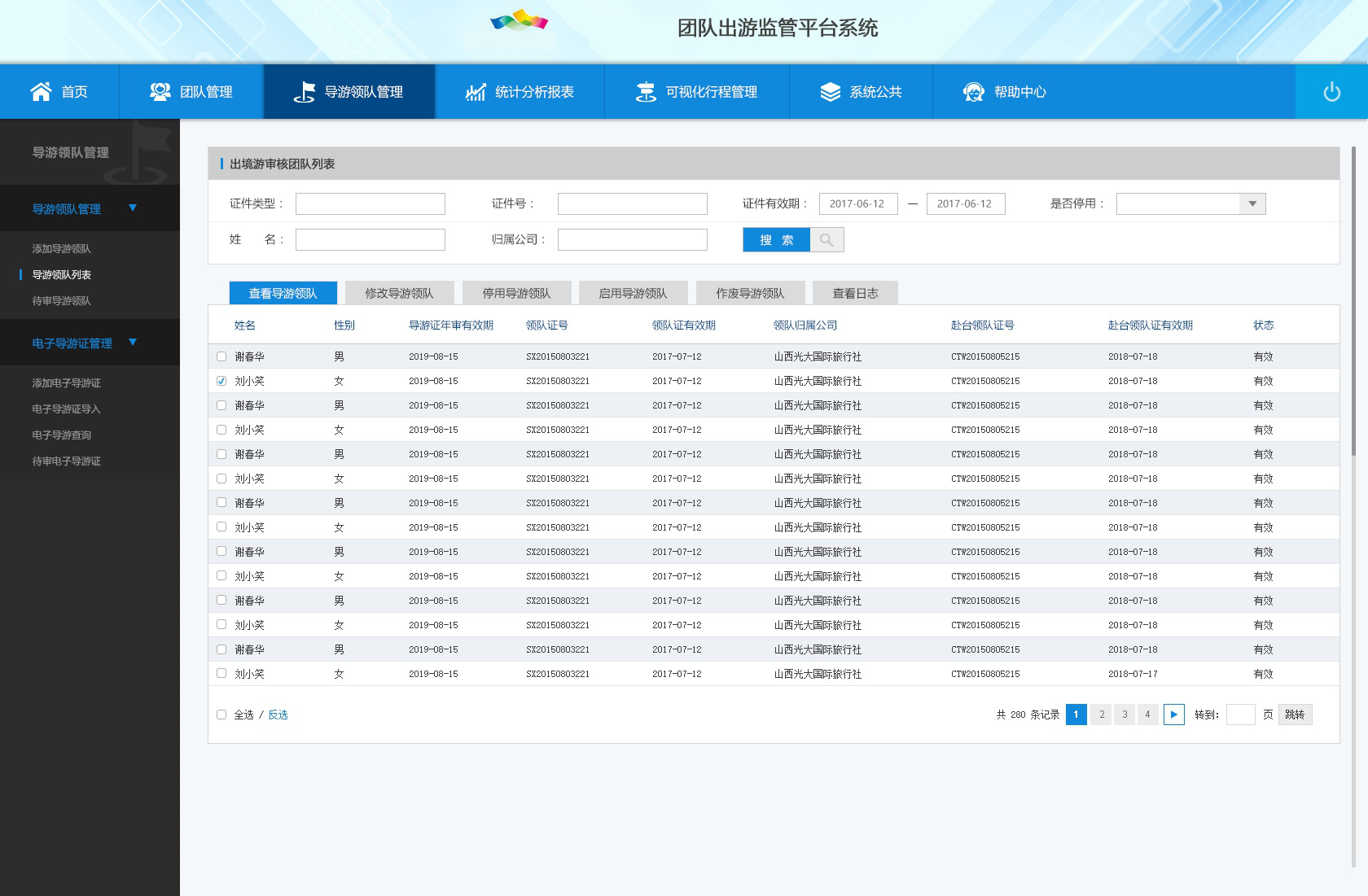 2) 導(dǎo)游/領(lǐng)隊(duì)管理:導(dǎo)游領(lǐng)隊(duì)管理、電子導(dǎo)游證管理。
