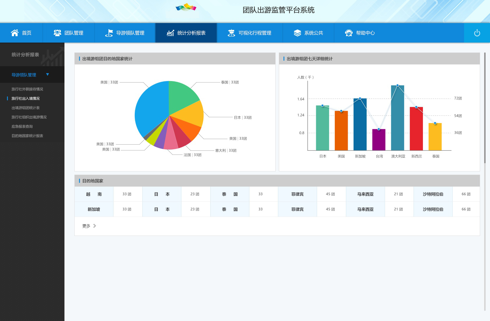 3) 統(tǒng)計(jì)分析報(bào)表:目的地國(guó)家統(tǒng)計(jì)表、應(yīng)急報(bào)表查詢、旅行社外聯(lián)接待情況、旅行社出入境情況、出境游組團(tuán)統(tǒng)計(jì)表。
