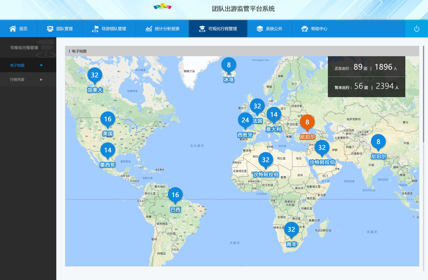 隨著出境旅游門檻越來越低,出境游熱度持續(xù)升溫,對(duì)出境旅游團(tuán)隊(duì)進(jìn)行有效管控就顯得至關(guān)重要,出境旅游團(tuán)隊(duì)監(jiān)測(cè)與分析系統(tǒng)對(duì)接國(guó)家旅游團(tuán)隊(duì)管理系統(tǒng)數(shù)據(jù),通過對(duì)旅游團(tuán)電子行程單和旅游合同數(shù)據(jù)的接入,實(shí)現(xiàn)對(duì)出境旅游團(tuán)隊(duì)監(jiān)測(cè),方便在發(fā)生旅游突發(fā)事件時(shí)迅速開展救援、服務(wù)工作。
