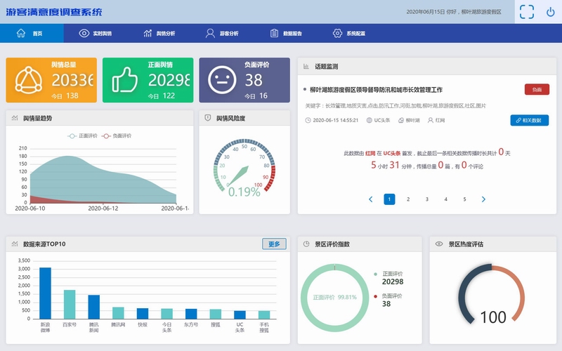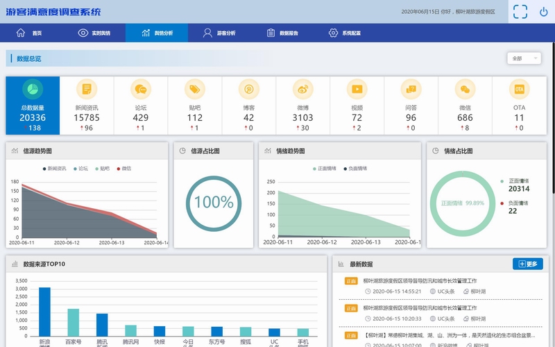 采集主流互聯(lián)網(wǎng)渠道上關于旅游景區(qū)、住宿、餐飲等方面的評價數(shù)據(jù)。得出游客對景區(qū)、酒店、餐飲等主要旅游要素的正面、負面、中性評價。識別各景區(qū)、酒店、餐飲網(wǎng)絡形象變化、市場優(yōu)勢和短板所在。