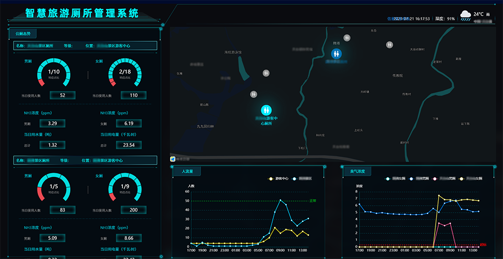 環(huán)境采集系統(tǒng),對整個公廁溫度,濕度,NH3、H2S等刺激性氣體進(jìn)行實(shí)時采集。上傳到服務(wù)器,然后下派任務(wù)給維護(hù)人員。無異常情況會每隔一段時間主動上報,并以報表的形式和圖標(biāo)形式呈現(xiàn)給管理員。