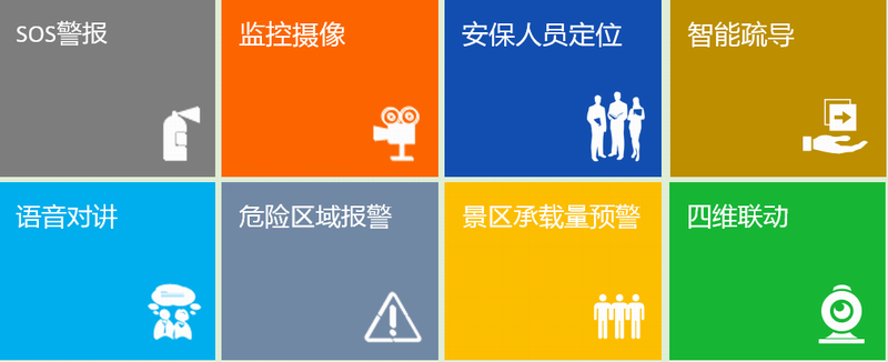 SOS警報(bào)、監(jiān)控?cái)z像、安保人員定位、語(yǔ)音對(duì)講、危險(xiǎn)區(qū)域報(bào)警、景區(qū)承載量預(yù)警、智能疏導(dǎo)、四維聯(lián)動(dòng)等