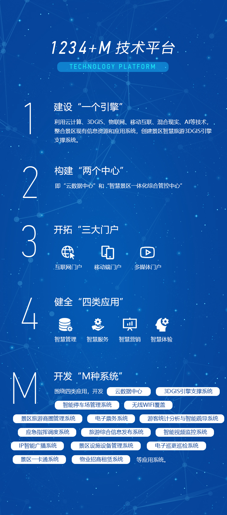 云野科技結(jié)合多年智慧景區(qū)建設(shè)經(jīng)驗及自身研發(fā)的成熟產(chǎn)品,緊緊圍繞“智慧管理、智慧服務(wù)、智慧營銷與智慧體驗”四類應(yīng)用,通過“1234+M”技術(shù)平臺的實施,實現(xiàn)景區(qū)智慧旅游建設(shè)目標(biāo)。