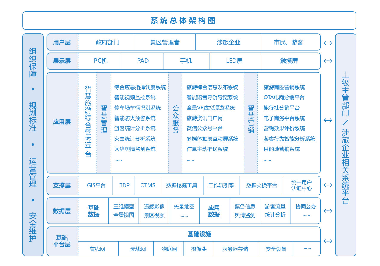 以云數(shù)據(jù)中心平臺為基礎(chǔ),以地理信息GIS平臺為支撐,以組織保障、標(biāo)準(zhǔn)規(guī)范、運維管理與安全保障為后盾,從綜合管理、游客服務(wù)與旅游營銷三大層面入手,采用互聯(lián)共享、融合提升和科學(xué)管理的先進(jìn)設(shè)計理念,逐步建立起特色鮮明、運轉(zhuǎn)高效的智慧旅游管理體系、服務(wù)體系和營銷體系。