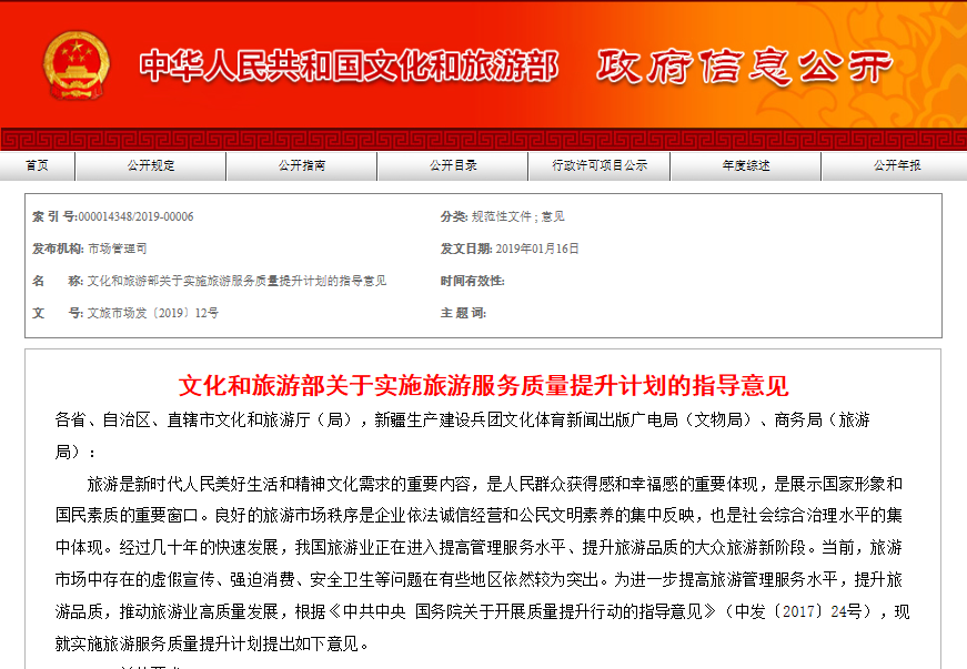 2019開年之際,文化和旅游部印發(fā)了《關于實施旅游服務質量提升計劃的指導意見》(以下簡稱《指導意見》)。