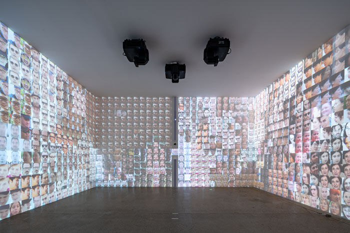 觀眾進(jìn)入空間后,系統(tǒng)自動識別人臉,通過算法分成兩類,左側(cè)是面部特征最不相似的人,右側(cè)是最相似的人。觀眾通過人臉識別感受大數(shù)據(jù)的普遍存在。它所涉及的問題包括自由與隱私的邊界。馮博一認(rèn)為,《識別》提示出警覺的同時,非常有趣。