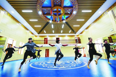 阿爾山市烏蘭牧騎隊(duì)員正在排練場排練舞蹈。