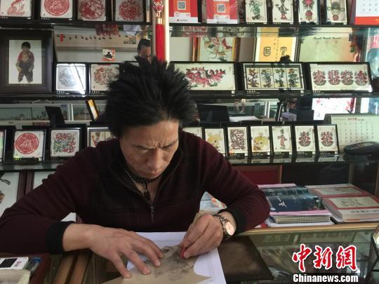甘肅皮影雕刻藝人趙德才伏案按照紙質模板雕刻皮影?!⒀γ?攝