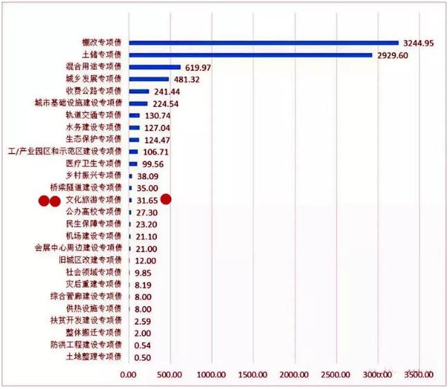 從今年1—5月新增專項債發(fā)行的品種和投向看,不難會發(fā)現(xiàn)在27類新增專項債品種中,棚改專項債超越土儲專項債以3244.95億元高居首位,其次是土儲專項債2929.60億元、城鄉(xiāng)發(fā)展專項債481.32億元、收費(fèi)公路專項債241.44億元。而用于文化旅游專項債31.65億元,位居第14位(見圖5)。這充分說明了,文化旅游作為地方政府專項債重點(diǎn)項目已經(jīng)成為不爭的事實。