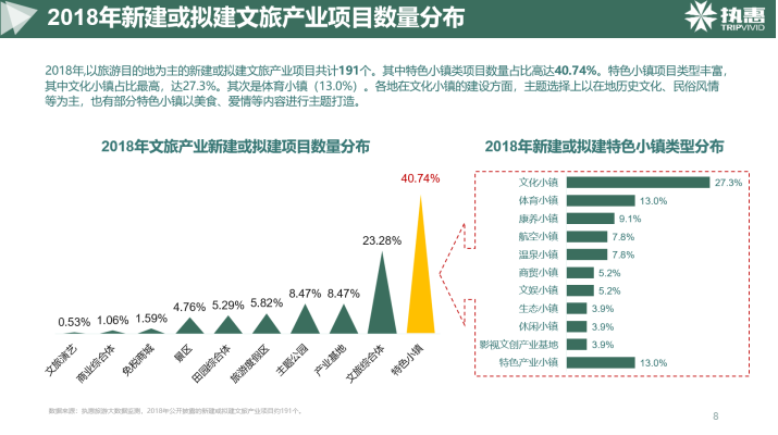 近年來,多個土地、金融、產(chǎn)融結(jié)合等政策的出臺有效帶動了特色小鎮(zhèn)和文旅綜合體等目的地類項目的繁榮發(fā)展。從數(shù)量上看,2018年以旅游目的地為主新建或擬建文旅產(chǎn)業(yè)項目共計191個,其中特色小鎮(zhèn)類項目數(shù)量占比高達40.74%,其次是文旅綜合體,占比23.28%。從投資金額上看,新建或擬建文旅綜合體項目投資總額高達2.24萬億,特色小鎮(zhèn)則是8,443億。