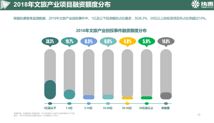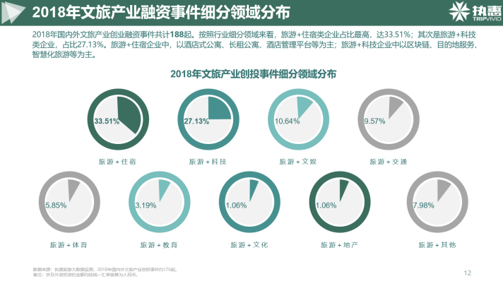 2018年國內(nèi)外文旅產(chǎn)業(yè)融資事件共計188起,那我們從這張圖上也能看出來資本市場在文旅大消費在領(lǐng)域的綜合動態(tài),其中投資旅游+住宿類項目融資占比最高,達33.51%;其次是旅游+科技類企業(yè),占比27.13%。