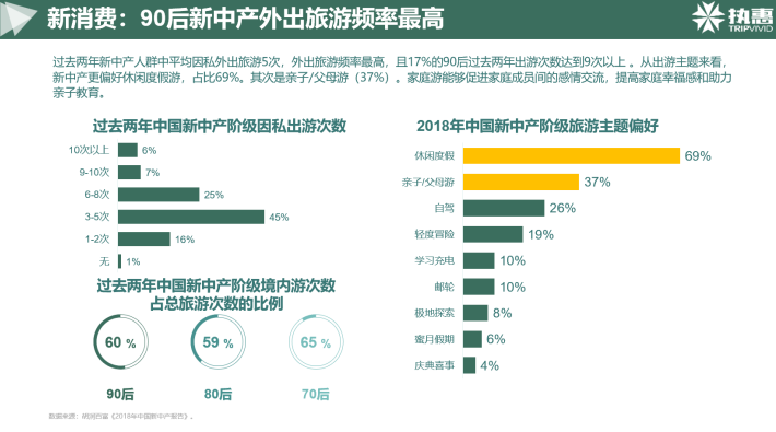 過去兩年新中產(chǎn)人群中平均因私外出旅游5次,特別值得注意的是,90后踐行“趁著年輕去旅游”的生活理念,外出旅游頻率最高,經(jīng)統(tǒng)計,17%的90后過去兩年出游次數(shù)達到9次以上。從出游主題來看,新中產(chǎn)更偏好休閑度假游,占比69%。其次是親子/父母游,占比37%。