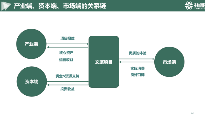 我們總結(jié)了產(chǎn)業(yè)端、資本端、市場端三個維度的情況,我們可以梳理出他們之間的一條關(guān)系鏈。產(chǎn)業(yè)端的前期投建依托于資本端的支持與助力,通過文旅項目給市場端帶來的優(yōu)質(zhì)的體驗,從而形成實際消費及良好的口碑,獲得最終的投資收益。對于產(chǎn)業(yè)端來說,這是一張項目發(fā)展結(jié)構(gòu)圖,對于資本端來說,這是一張現(xiàn)金流向圖。