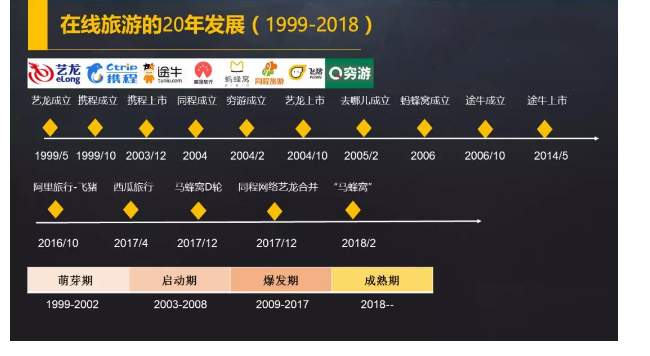 這是一張在線旅游發(fā)展關(guān)鍵節(jié)點的時間圖,大致可以分為4個時期,從1999年攜程藝龍成立的萌芽期,到2003年-2008年間的啟動期。