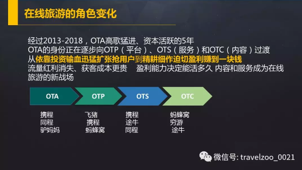 在線旅游已經(jīng)從單純OTA(代理)到OTP(平臺)到OTC(內(nèi)容)到OTS(服務(wù))多種模式并存和角色的遷移,只做賣貨渠道的公司,已經(jīng)沒有持續(xù)生存的空間。
