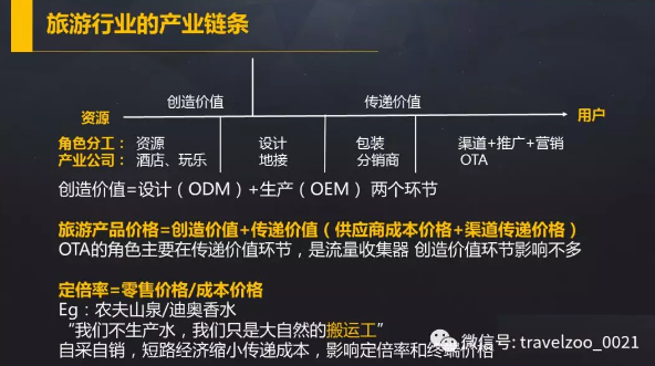 我們今天看到的旅游供應(yīng)商、資源商其實是在創(chuàng)造價值環(huán)節(jié),而OTA、線下門店、旅游分銷商、對產(chǎn)品的推廣、宣傳都是在傳遞價值環(huán)節(jié)。