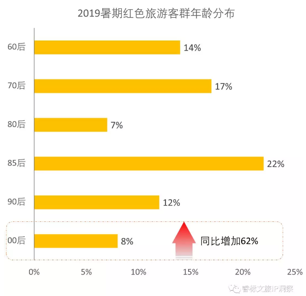 從出游群體來(lái)看,年輕化逐漸成為紅色旅游的新趨勢(shì)。85后以22%的占比,成為紅色旅游市場(chǎng)的主力人群,70后緊隨其后,00后占比同比增幅達(dá)62%。