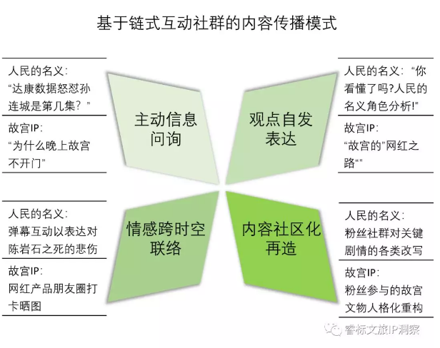 和故宮超級(jí)IP一樣的是,《人民的名義》雖然與特定地點(diǎn)無(wú)關(guān),但都成功構(gòu)建了基于鏈?zhǔn)交?dòng)社群的內(nèi)容傳播模式。主動(dòng)信息問(wèn)詢、觀點(diǎn)自發(fā)表達(dá)、情感跨時(shí)空聯(lián)絡(luò)和內(nèi)容社區(qū)化再造等等消費(fèi)者行為,使得受眾認(rèn)知突破嚴(yán)肅場(chǎng)景,為超級(jí)IP的轉(zhuǎn)型與構(gòu)建提供了強(qiáng)大流量。