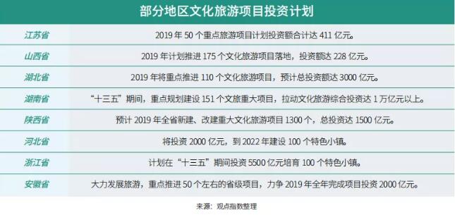 從各省份重點項目推進(jìn)計劃上看,各地方政府對于發(fā)展文化旅游業(yè)的決心也可見一斑。據(jù)了解,在已公布的各省級行政單位重點項目計劃中,文旅項目的投資都成為其中重要的板塊。與此同時,個別省份在2019年計劃推進(jìn)的重點文化旅游項目甚至達(dá)上千個,計劃投資總額最高達(dá)3000億元。