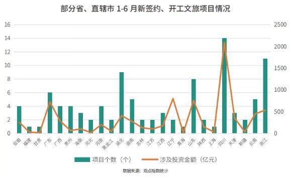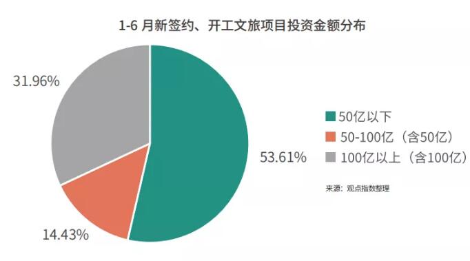 從單體項目投資金額上看,文旅項目表現(xiàn)出向大體量、高投入發(fā)展的趨勢。今年1-6月新簽約、開工文旅項目中,單體項目投資金額在50億以下的依然在大多數(shù),占總投資項目的53.61%;50-100億(含50億)投資金額的項目占比為14.43%。
