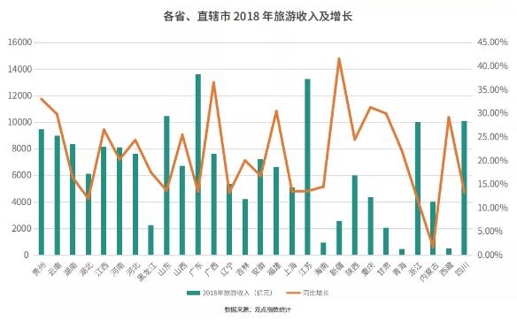 但另一方面,中西部地區(qū)省份在旅游總收入增長方面卻遠(yuǎn)超過東部地區(qū)。統(tǒng)計數(shù)據(jù)顯示,2018年,在旅游總收入增長排名前十的省、直轄市上,80%集中在了中西部地區(qū)。當(dāng)中,中、西部旅游收入增長率分別為25.79%、27.69%,遠(yuǎn)超過東部地區(qū)的9.63%;此外,中、西部旅游人次增長分別為18.62%、22.65%,而東部地區(qū)僅為3.55%。