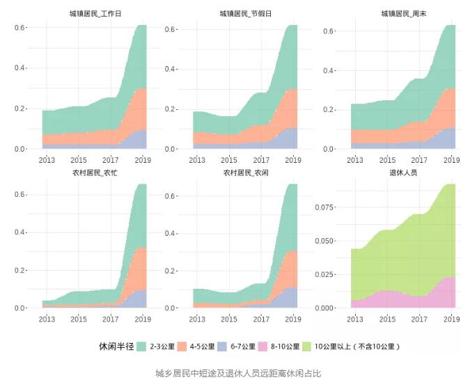 從休閑空間來看,城鄉(xiāng)居民休閑半徑不斷擴(kuò)大,中短途距離休閑占比大幅提高。2019年我國城鎮(zhèn)居民工作日、周末和節(jié)假日期間休閑半徑在2-7公里以內(nèi)的比重分別為61.2%、63.1%和62.1%,農(nóng)村居民農(nóng)閑時(shí)離家2-3公里以內(nèi)休閑占比為35.8%,越來越多的城鄉(xiāng)居民在休閑時(shí)間走出家門,享受更為豐富多彩的戶外休閑活動(dòng)。2019年退休居民離家8公里以上休閑比重為9.2%,旅游和郊野游憩成為越來越多退休居民的重要休閑方式。