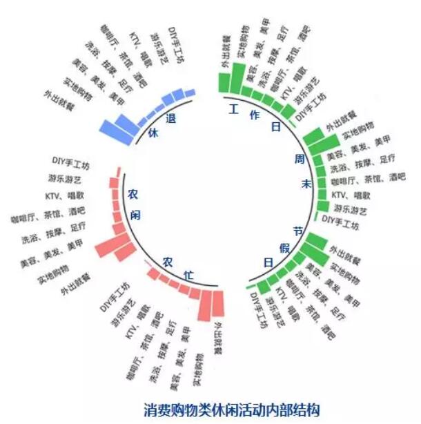 從國民休閑行為的區(qū)域差異來看,在調(diào)研的10個(gè)城市中,北京、上海、廣州、成都4市城鎮(zhèn)居民在周末、節(jié)假日更喜歡外出休閑,其選擇在離家3-10公里范圍內(nèi)進(jìn)行休閑的人數(shù)占比具有絕對(duì)優(yōu)勢(shì);長(zhǎng)沙、西安、沈陽、武漢4市的農(nóng)村居民在農(nóng)閑時(shí)喜歡到離家3-10公里范圍內(nèi)進(jìn)行休閑;沈陽、武漢、長(zhǎng)沙、杭州4市退休居民則喜歡遠(yuǎn)距離休閑。從休閑內(nèi)容來看,北京、上海、廣州、成都4市城鎮(zhèn)居民在周末、節(jié)假日喜歡旅游、消費(fèi)購物和參與文化類休閑活動(dòng),其中,選擇消費(fèi)購物的人數(shù)占比在10個(gè)城市中具有絕對(duì)優(yōu)勢(shì);武漢、長(zhǎng)沙、廣州、西安4市農(nóng)村居民農(nóng)閑時(shí)喜歡文化類休閑活動(dòng),而沈陽、杭州等市農(nóng)村居民農(nóng)閑時(shí)更喜歡消費(fèi)購物;武漢、沈陽、杭州等市退休人員更喜歡旅游和體育健身。