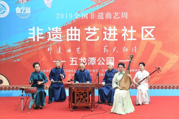 9月6日下午,2019全國非遺曲藝周第一輪進社區(qū)演出在濟南著名景區(qū)五龍?zhí)豆珗@內(nèi)的舞臺上正式開始。一架揚琴、一把琵琶和中阮、兩把二胡,加上5個清音鼓,10余位南昌清音演員用優(yōu)雅的曲調(diào)和清脆的鼓聲向市民游客展示著《今日猶聞翰墨香》。極具南昌地域特色的優(yōu)雅唱腔以及表演角色將聽眾帶回當年王勃即興提寫《滕王閣序》時的情景。非遺傳承人還為現(xiàn)場觀眾表演了興寧竹板歌《軍長買雞》、壯族八音坐唱《妯娌共話好愿景》、四川揚琴《拷紅》、桂林漁鼓《藍絲帶》。