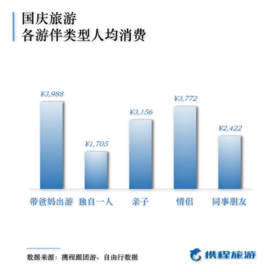 從消費(fèi)來看,根據(jù)攜程跟團(tuán)游和自由行數(shù)據(jù)顯示,“國內(nèi)游消費(fèi)力前十強(qiáng)城市”依次為深圳、北京、沈陽、濟(jì)南、天津、上海、寧波、福州、廈門和青島。這些城市國慶旅游單次國內(nèi)游人均花費(fèi)超過3000元,其中深圳人最舍得花錢,單次國內(nèi)旅游人均花費(fèi)達(dá)到了3324元。在各年齡段的花費(fèi)上,50后成為最舍得花錢的人群,單次旅游人均花費(fèi)達(dá)到了3640元。
