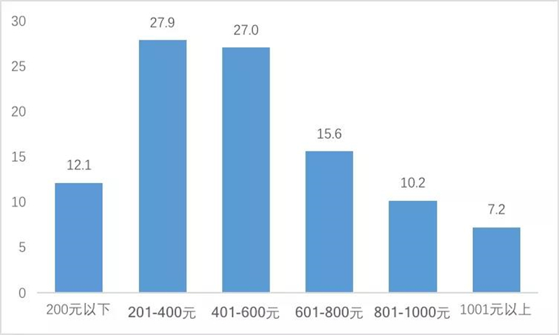 專項調(diào)查數(shù)據(jù)顯示,夜游花費(fèi)在200-400元和400-600元之間的比重最高,分別為27.9%和27%,600-800元和200元以下居中,分別占比15.6%和12.1%,1000元以上比重最低。