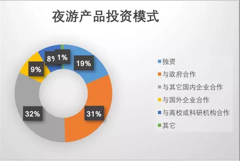 專項調(diào)查數(shù)據(jù)顯示,參與調(diào)研的657家旅游企業(yè)中,夜游產(chǎn)品投資規(guī)模在5%以下的企業(yè)占比23%,投資規(guī)模在6%-10%的企業(yè)占比28%,投資規(guī)模在10%-20%的企業(yè)占比26%,投資規(guī)模超過30%的企業(yè)占22%。投資模式方面,旅游企業(yè)更傾向與政府合作(30.7%)或與國內(nèi)其他企業(yè)合作(32.6%),獨(dú)資(18.7%)或與國外企業(yè)合作(9.1%)其次,7.9%的企業(yè)愿意與高校或科研單位合作。