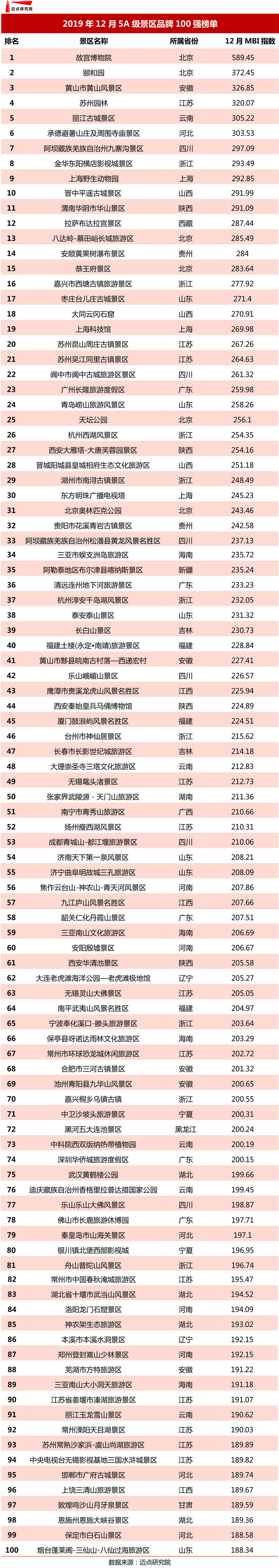 下是邁點(diǎn)研究院獨(dú)家發(fā)布的“2019年12月5A級(jí)景區(qū)品牌100強(qiáng)榜單”。月度5A級(jí)景區(qū)品牌百?gòu)?qiáng)榜單由邁點(diǎn)研究院研制,旨在通過(guò)數(shù)據(jù)解讀景區(qū)在互聯(lián)網(wǎng)及移動(dòng)互聯(lián)網(wǎng)領(lǐng)域的影響力,為景區(qū)制定戰(zhàn)略方案提升品牌發(fā)展賦能。