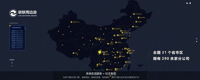 聯(lián)聯(lián)通過“本地生活服務(wù)+社交裂變”的商業(yè)營銷模式,除了為用戶提供“景區(qū)門票、度假酒店、特色餐飲”等周邊游產(chǎn)品服務(wù)外,更是不斷深耕本地生活服務(wù)領(lǐng)域,通過對本地消費者生活服務(wù)需求的深度研判,集合“休閑、娛樂、餐飲”等多個類目,打造本地生活服務(wù)平臺。從最初的西南地區(qū)的平臺起家,如今已經(jīng)在31個省市區(qū)擁有290余家分公司。