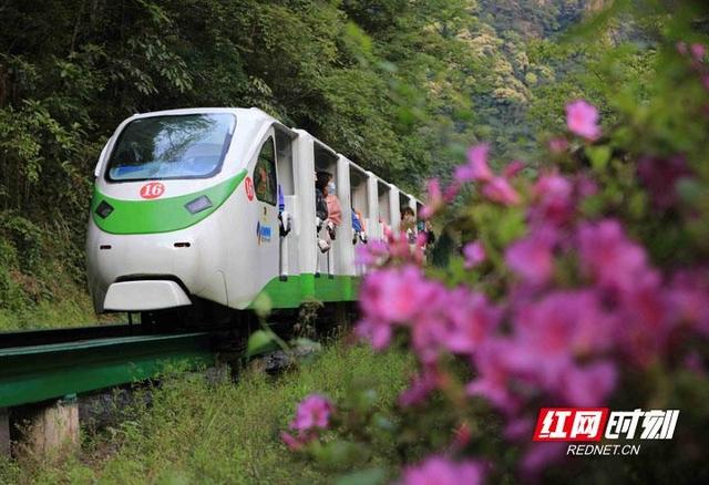 游客乘觀光電車在武陵源十里畫廊游覽。(吳勇兵 攝)