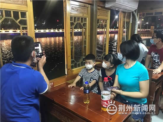 夜幕降臨,華燈初上,荊州古城賓陽樓披上五彩斑斕的“輕紗”,盡顯燈影交織下的絢麗多姿,古老的城墻散發(fā)出時尚耀眼的光芒。護城河畔,金鳳騰飛,燈火閃爍、游人如織,一步一景,人文氣息濃厚。一艘艘仿古畫舫穿梭在波光粼粼的護城河上,游客們乘船夜游,在習(xí)習(xí)涼風(fēng)中感受著夜色下如詩如畫、美不勝收的古城夜景。來自武漢的游客楊榮一家四口趁著夜晚些許清涼出來游玩,感受和白天不一樣荊州古城。