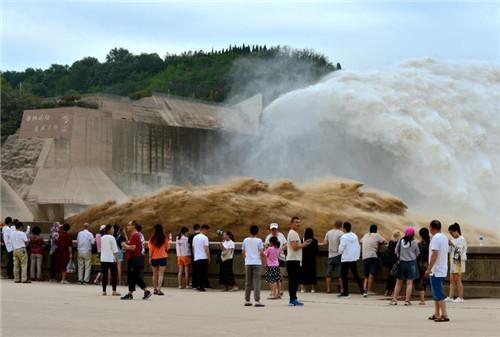 黃河小浪底水利樞紐工程,是體現(xiàn)黃河歷史文化和自然風光的大型山岳湖泊型風景區(qū),296平方公里的水域中湖汊河巷密布,具有“北方千島湖”、“中原北戴河”的美譽。雙節(jié)期間,恰逢小浪底水庫再次開閘泄洪,黃河激流從壩體中的洞群噴涌而出,形成多條氣勢磅礴的“巨瀑”飛流而下,展現(xiàn)出“黃河之水天上來”的壯觀景象。每天前來觀賞黃河飛瀑奇觀的游客絡繹不絕。