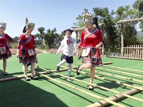在塢根鎮(zhèn)喜柿山谷,游客學(xué)跳竹竿舞。