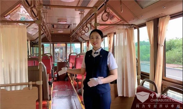 復古方正車身,妝扮一襲紅衣,銀隆新能源仿古鐺鐺車外觀酷似民國有軌電車,別具一格。車內(nèi)寬敞大方,搭配木紋地板、軟墊座椅,搭載特色展柜;“英雄攀枝花,陽光康養(yǎng)地”標語浮于車身兩側(cè),攀枝花市標綴于車尾,滿載當?shù)卦氐蔫K鐺車,穿行在紅格鎮(zhèn)的大街小巷。