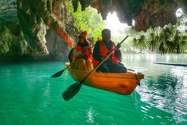 采風(fēng)團(tuán)一行冒雨驅(qū)車來到了青山疊嶂的土博鎮(zhèn)琴懷村,去尋找被稱為“柳版九寨溝”的狼口泉。狼口泉,潭水碧綠,青山環(huán)繞,據(jù)說潭底通地下河,水深逾70米。碧綠的小河從納社屯旁靜靜流過,明河流經(jīng)村野,水靜流深,村民的扁舟劃波而過,便是一張鄉(xiāng)村游樂圖。暗河穿越巖洞,回歸野性,水鴨在淺水上隨心覓食,及膝的河水越過石灘,沖下飛瀑。鐘乳石洞神秘而誘人,陽光從洞頂?shù)目p隙中透入,更增添了一絲仙氣。