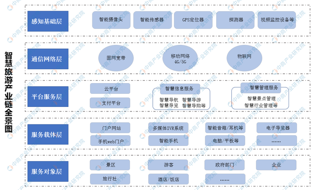 智慧旅游產(chǎn)業(yè)鏈所涉及的環(huán)節(jié)復(fù)雜、行業(yè)眾多,大大超出了傳統(tǒng)旅游行業(yè)的范疇。從結(jié)構(gòu)來(lái)看,智慧旅游產(chǎn)業(yè)鏈中既有水平供需關(guān)系,也存在垂直協(xié)作關(guān)系。同時(shí),隨著技術(shù)的不斷提升、需求更新,持續(xù)不斷有新的企業(yè)進(jìn)入產(chǎn)業(yè)鏈。中商產(chǎn)業(yè)研究院整理了我國(guó)智慧旅游產(chǎn)業(yè)鏈圖主要包括:感知基礎(chǔ)層、通信網(wǎng)絡(luò)層、平臺(tái)服務(wù)層、服務(wù)載體層以及服務(wù)對(duì)象層五大層面,如下圖所示: