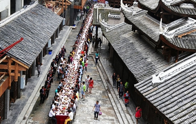 穿過(guò)畎夷門(mén)后的“時(shí)空隧道”,菜香撲鼻——正值晌午,百米長(zhǎng)桌宴上,苗家九大碗等特色美食,正引得來(lái)客大快朵頤。