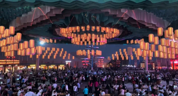 迦陵頻伽是古希臘、古印度、中亞與中國本土文化元素交融互鑒的最佳例證之一,生動(dòng)闡釋了敦煌文化兼收并蓄、寬容博大的品格。設(shè)計(jì)者將迦陵頻伽與燈輪圖像元素相組合,大唐盛世的感覺瞬間拉滿,再加上漢唐街、西域街和市集廣場設(shè)立的云闕飛仙牌樓、賓至疊瀑、云闕仙宮等特色景觀,讓人在動(dòng)靜斑斕間沉浸式體驗(yàn)傳統(tǒng)文化與現(xiàn)代文化碰撞的極致魅力。
