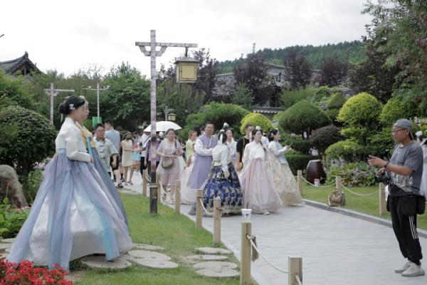 走進(jìn)延吉中國(guó)朝鮮族民俗園,隨處可見(jiàn)身著朝鮮族服飾的游客,穿梭于青瓦白墻的院落里,抬眸揮手間皆是風(fēng)景。在民俗園里當(dāng)一天“公主”,在延吉網(wǎng)紅彈幕墻前,手持一杯印有“延吉”字樣的咖啡拍一張照片已經(jīng)成為一種時(shí)尚。