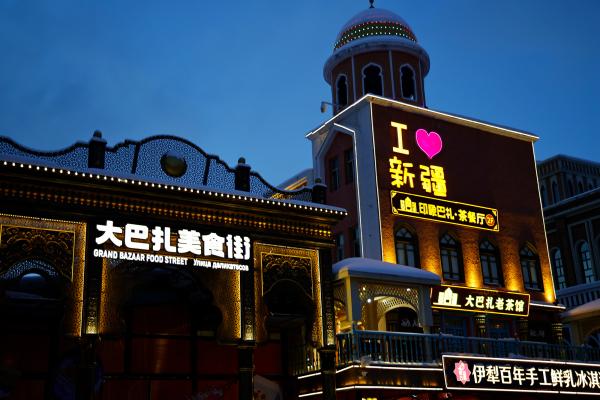 烏魯木齊的天山區(qū)解放南路的國際大巴扎,是一個(gè)集旅游觀光、民族商貿(mào)、餐飲、民族藝術(shù)展示和零售五大業(yè)態(tài)為一體的旅游觀光景區(qū)。享有“新疆之窗”和“中亞之窗”的美譽(yù)。 晚7點(diǎn),一場獨(dú)特的新疆民俗風(fēng)情表演,拉開了大巴扎的夜場。參觀完融合了西亞和中亞建筑元素的大巴扎建筑群,游客們走進(jìn)了阿凡提大巴扎馕體驗(yàn)館。