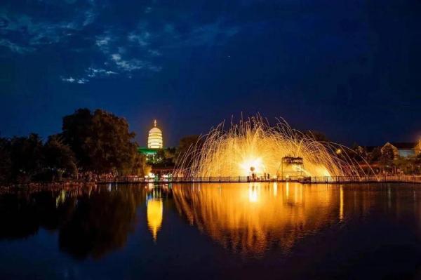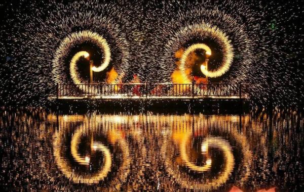 國家級非遺打鐵花技藝在漁灣景區(qū)獲得了前所未有的表達維度。這項始于北宋的古老技藝,曾只是單一的民俗表演,如今在數(shù)字技術(shù)的加持下煥發(fā)新生。2025版《夢幻漁灣》中,打鐵花已升級至2.0版本,與重慶銅梁火龍表演深度交融——表演者赤膊舞動噴火巨龍,在鐵花飛濺的夜空下騰挪跳躍,形成“火樹銀花龍在天”的奇觀。