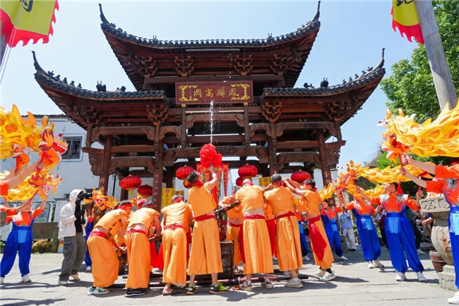 桐廬翙崗古村的活化利用提供了另一種可能。每日三場(chǎng)的“射洋龍民俗大巡游”成為流動(dòng)的風(fēng)景——旗牌開道,鑼鼓喧天,手龍方陣蜿蜒前行,洋龍噴水祈福。“古村漫街奇遇記”巧妙融合葉淺予《富春人物畫譜》場(chǎng)景,老式理發(fā)店、郵局、電影院與村民生活場(chǎng)景交織,游客在街角邂逅舊時(shí)光。