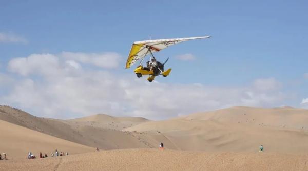 百米高空之下,碧波蕩漾的月牙泉與連綿起伏的沙丘形成強(qiáng)烈視覺(jué)沖擊,游客像壁畫(huà)中的飛天一樣翱翔天空,將千年敦煌的壯美畫(huà)卷化作觸手可及的云端體驗(yàn)。