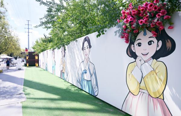 近日,中國朝鮮族民俗園美食街新增一處亮眼景觀——美辰打卡墻。墻上繪制了7名身著朝鮮族傳統(tǒng)服飾、頭頂各式鮮花裝飾的少女形象,吸引了眾多游客駐足拍照,成為園區(qū)又一熱門打卡地。這一創(chuàng)意源于延邊春天傳媒項目團隊在網(wǎng)上看到的一幅老墻繪畫作品。畫面中人物與墻面環(huán)境的融合感給了團隊靈感,他們在此基礎(chǔ)上延伸思考,結(jié)合民俗園的文化特色,決定以朝鮮族服飾為核心元素,打造美辰打卡墻。傍晚時分,中國朝鮮族民俗園美食街的美辰打卡墻前,仍聚集著拍照的游客。