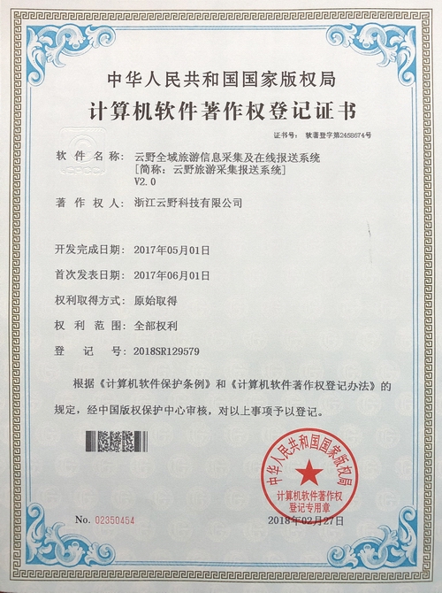 《云野全域旅游信息采集及在線報送系統(tǒng)V2.0》于2018年2月27日被正式授予《中華人民共和國國家版權(quán)局計算機軟件著作權(quán)登記證書》,登記號為2018SR129579。