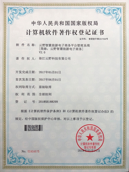 《云野智慧旅游電子商務(wù)平臺管理系統(tǒng)V2.0》于2018年3月21日被正式授予《中華人民共和國國家版權(quán)局計算機軟件著作權(quán)登記證書》,登記號為2018SR188299。